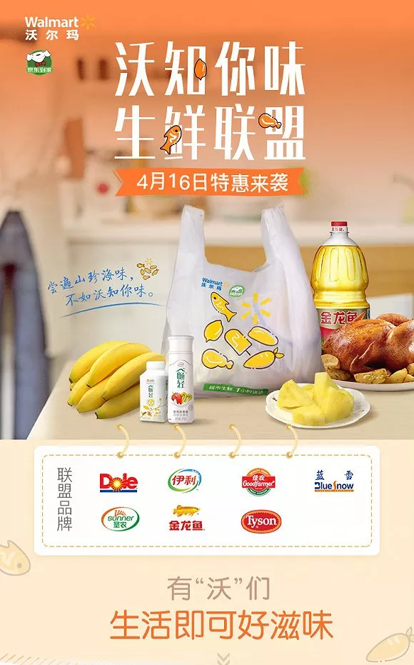 4月16日,沃爾瑪聯(lián)合京東到家、泰森、伊利、都樂、圣農(nóng)、藍雪、佳農(nóng)、金龍魚等七大生鮮商品供應(yīng)商,成立了“生鮮聯(lián)盟”。沃爾瑪表示,未來會有更多供應(yīng)商將加入其中。
