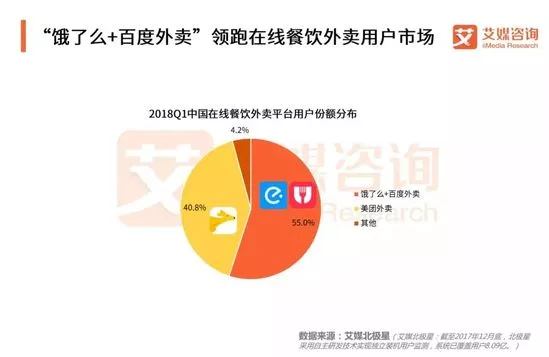 iiMedia Research(艾媒咨詢)數(shù)據(jù)顯示,在2018年第一季度,餓了么與百度外賣仍占優(yōu)勢,市場用戶份額占比達(dá)55.0%,美團外賣占比40.8%緊隨其后,市場格局兩家獨大。