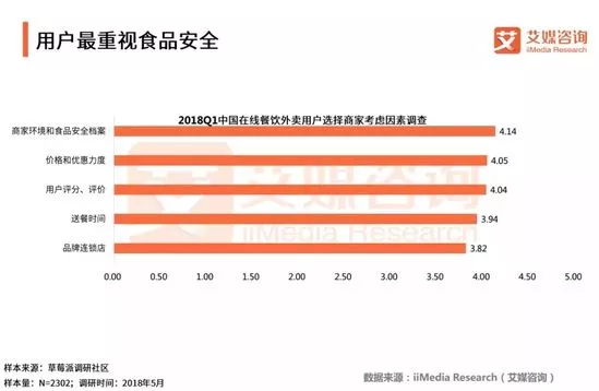 iiMedia Research(艾媒咨詢)數(shù)據(jù)顯示,在眾多因素的評分中(以5分為滿分),受訪在線外賣用戶最看重商家環(huán)境及食品安全檔案。其次,其他用戶的評分、評價,以及商家的價格與優(yōu)惠力度也較為重要。