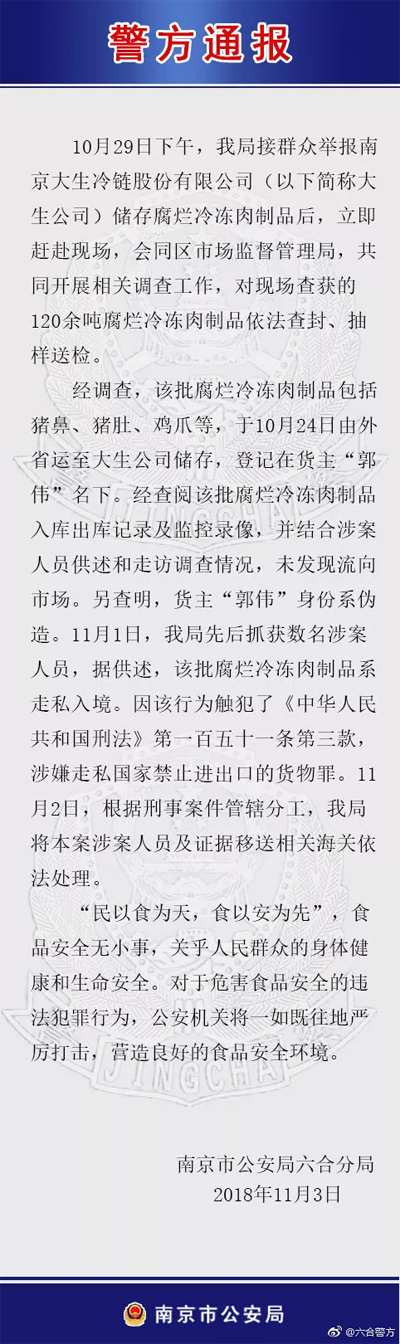 南京市公安局六合分局官方微博@六合警方發(fā)布關(guān)于南京大生冷鏈股份有限公司儲(chǔ)存腐爛冷凍肉制品調(diào)查情況的通報(bào)如下: