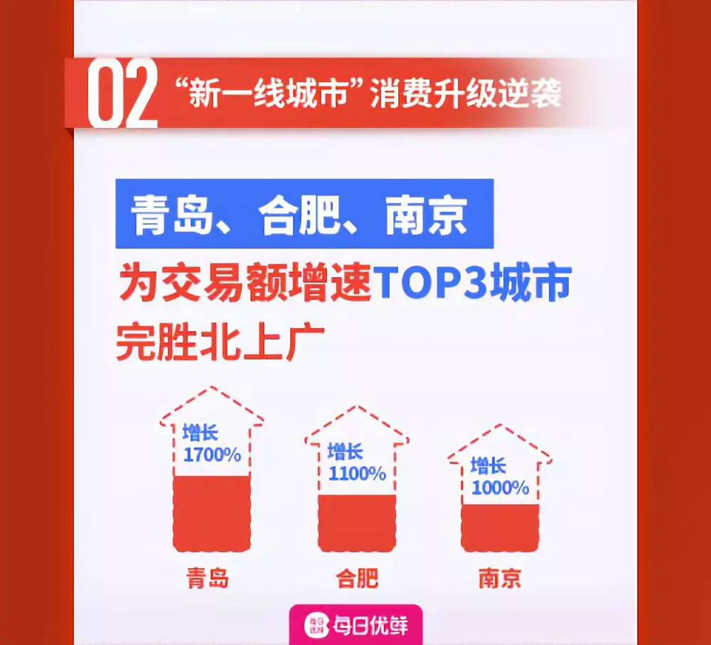 數(shù)據(jù)報告稱,以青島為代表的“新一線城市”生鮮消費實力驚人。與去年同期相比,青島、合肥、南京交易額同比增速位列全國前三,實現(xiàn)消費升級逆襲,超過北上廣。