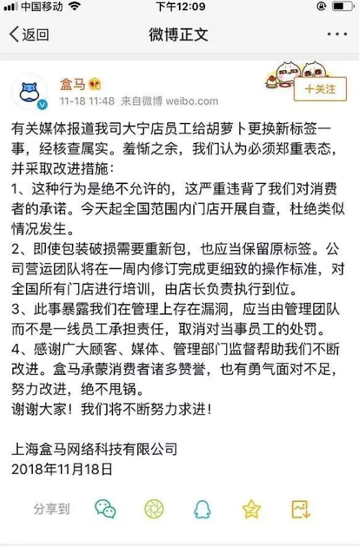 此外,11月18日,盒馬鮮生通過(guò)官方微博回應(yīng)稱,該事件經(jīng)核查屬實(shí)。即使包裝破損需要重新包,也應(yīng)當(dāng)保留原標(biāo)簽,公司營(yíng)運(yùn)團(tuán)隊(duì)將在一周內(nèi)修訂完成更細(xì)致的操作標(biāo)準(zhǔn),對(duì)全國(guó)所有門(mén)店進(jìn)行培訓(xùn),由店長(zhǎng)負(fù)責(zé)執(zhí)行到位。該事件暴露了管理的漏洞,應(yīng)由管理團(tuán)隊(duì)而非一線員工承擔(dān)責(zé)任,取消對(duì)當(dāng)事員工的處罰。