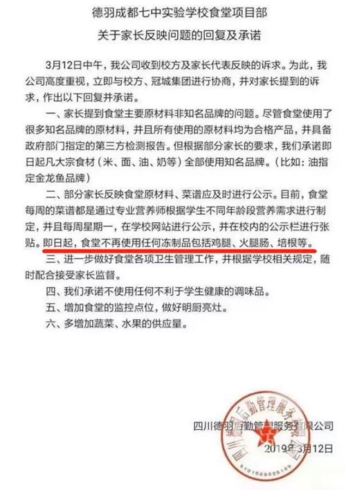 昨天,德羽后勤表示,學(xué)校使用的所有材料均為合格產(chǎn)品,并有政府部門指定的第三方檢測(cè)報(bào)告;公司從即日起將停止使用任何凍制品,并在學(xué)校網(wǎng)站內(nèi)進(jìn)行公示;對(duì)于學(xué)生家長(zhǎng)反映的調(diào)味品問(wèn)題,公司也承諾“不使用任何不利于學(xué)生健康的調(diào)味品”。