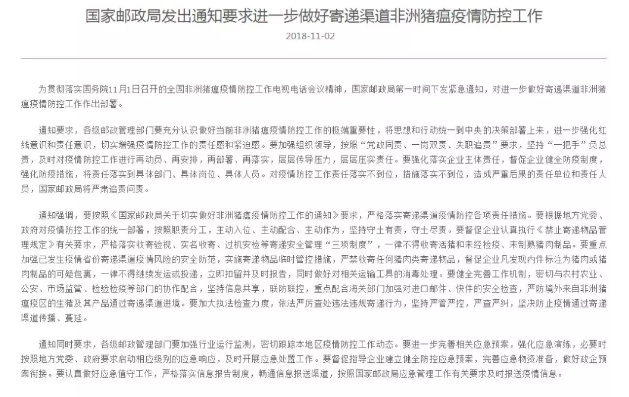 要健全完善工作機(jī)制,密切與農(nóng)村農(nóng)業(yè)、公安、市場監(jiān)管、檢驗(yàn)檢疫等部門的協(xié)作配合,堅(jiān)持信息共享,聯(lián)防聯(lián)控,重點(diǎn)配合海關(guān)部門加強(qiáng)對進(jìn)口郵件、快件的安全檢查,嚴(yán)防境外來自非洲豬瘟疫區(qū)的生豬及其產(chǎn)品通過寄遞渠道進(jìn)境。