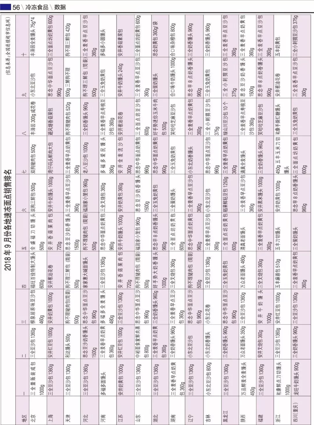 16個(gè)區(qū)域的速凍面點(diǎn)排名中,三全占了10個(gè)第一,其中豆沙包表現(xiàn)尤其搶眼。