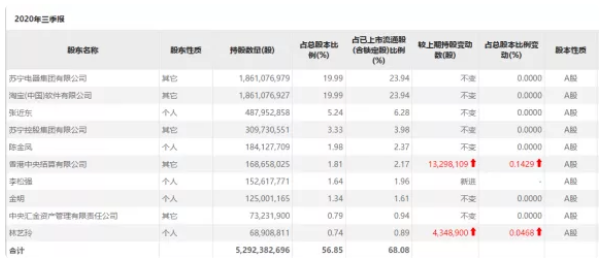 翻看A股上市公司蘇寧易購三季報十大流通股東名單發(fā)現(xiàn),阿里巴巴子公司淘寶(中國)軟件有限公司持有蘇寧易購20%的股權,位列第二大流通股東,而蘇寧控股集團有限公司位列第四大流通股東。
