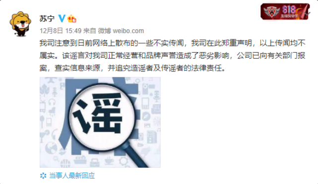 盤后,蘇寧集團在其官方微博上緊急回應上述傳聞:我司注意到日前網(wǎng)絡上散布的一些不實傳聞,我司在此鄭重聲明,以上傳聞均不屬實。該謠言對我司正常經(jīng)營和品牌聲譽造成了惡劣影響,公司已向有關部門報案,查實信息來源,并追究造謠者及傳謠者的法律責任。